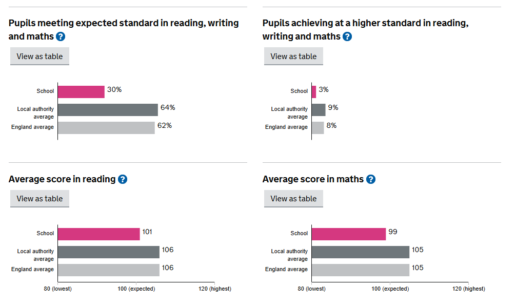Ofsted provides an “Inspection Dashboard” to summarise the school’s performance. The link to this is below, but please remember that this includes all children, including the Support Base, and national comparisons do not take account of this.